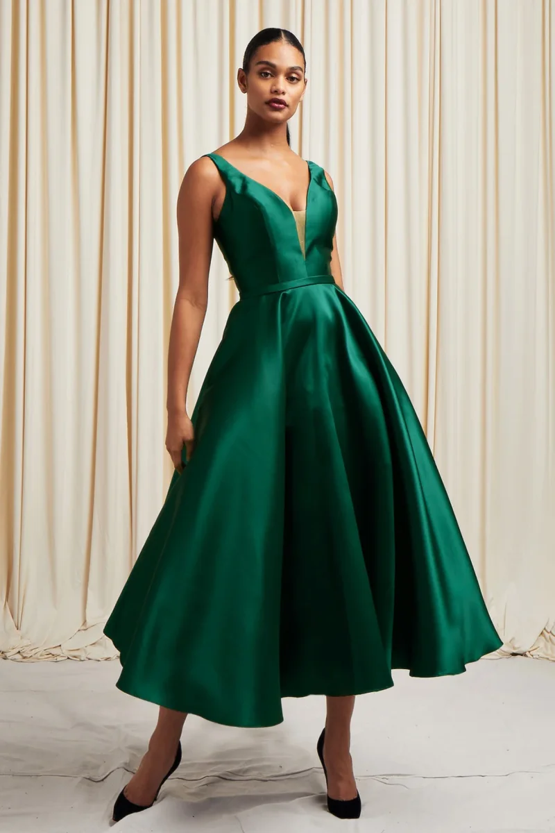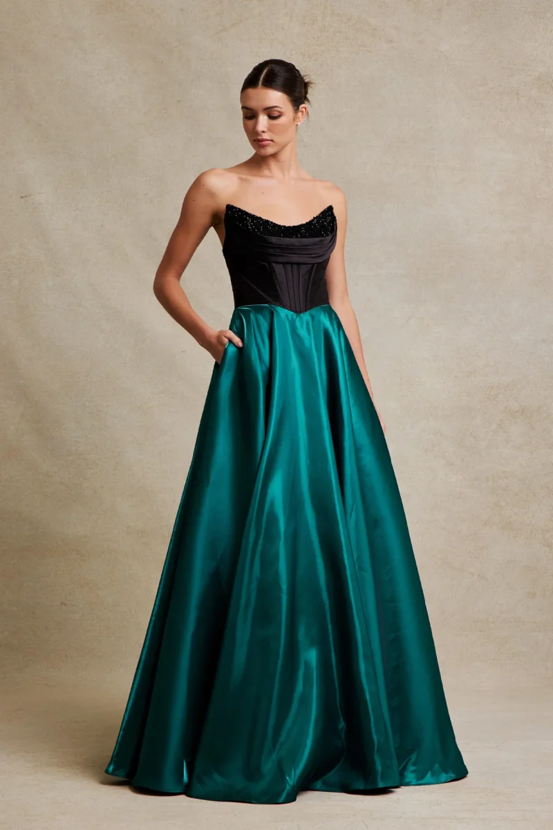 Vestido Corte en A de Satén con Bordado en el Escote Bicolor Black-Green