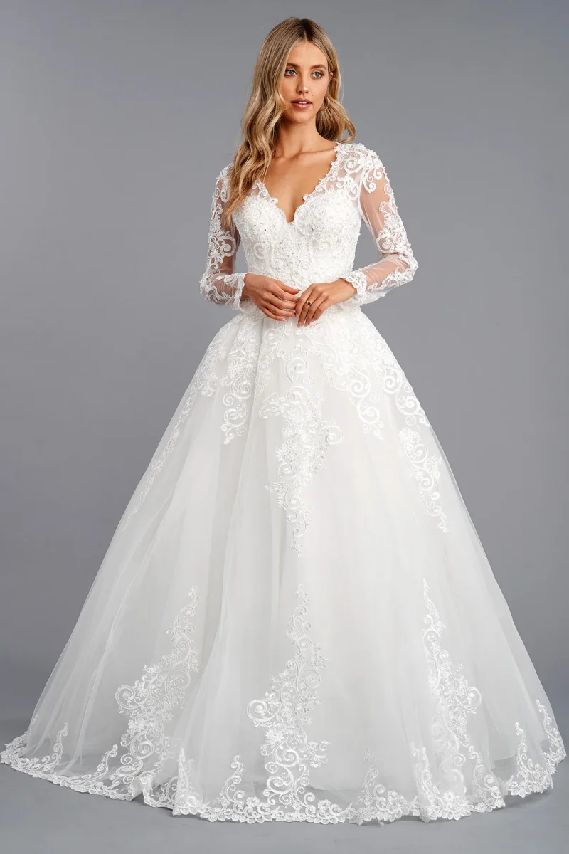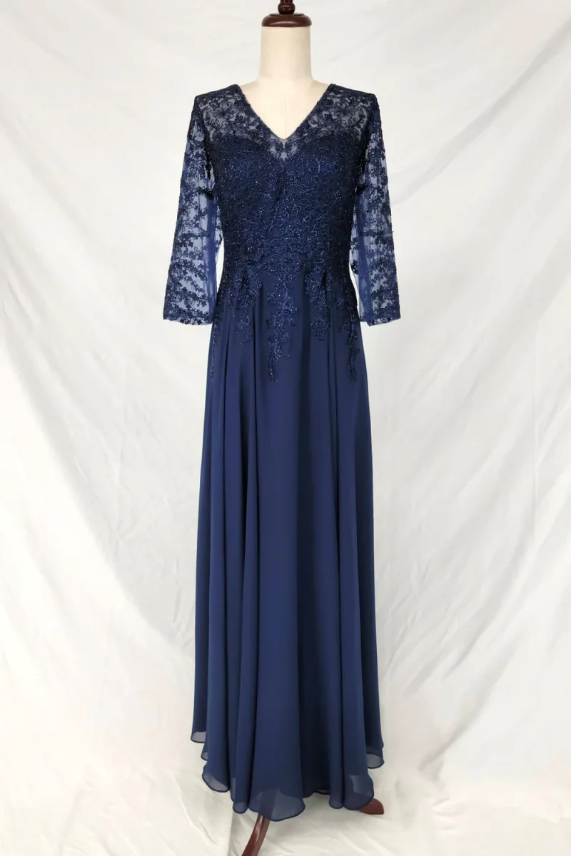 Vestido Largo en Corte A con Mangas 3/4, Escote en V y Bordados con Pedrería (Varios Colores)