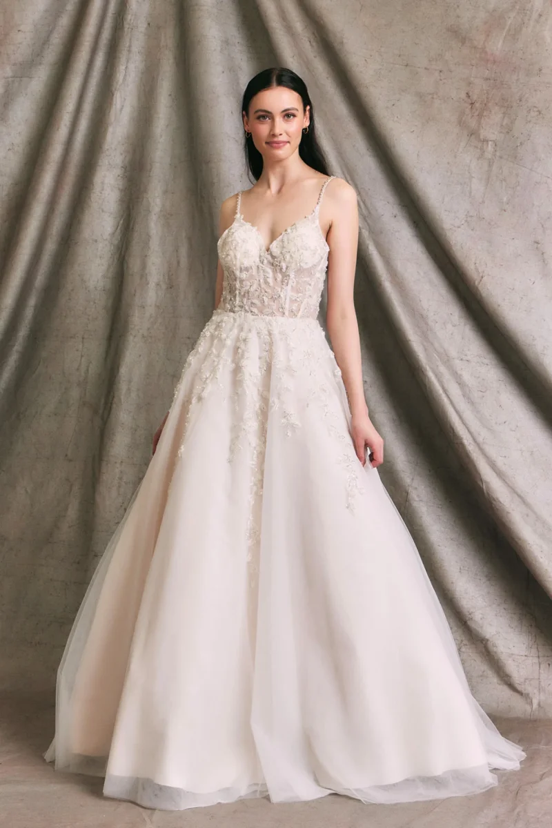 Vestido con Falda a los Tobillos con Brillos y Corpiño de Tul con Encaje Bordado (Varios Colores)