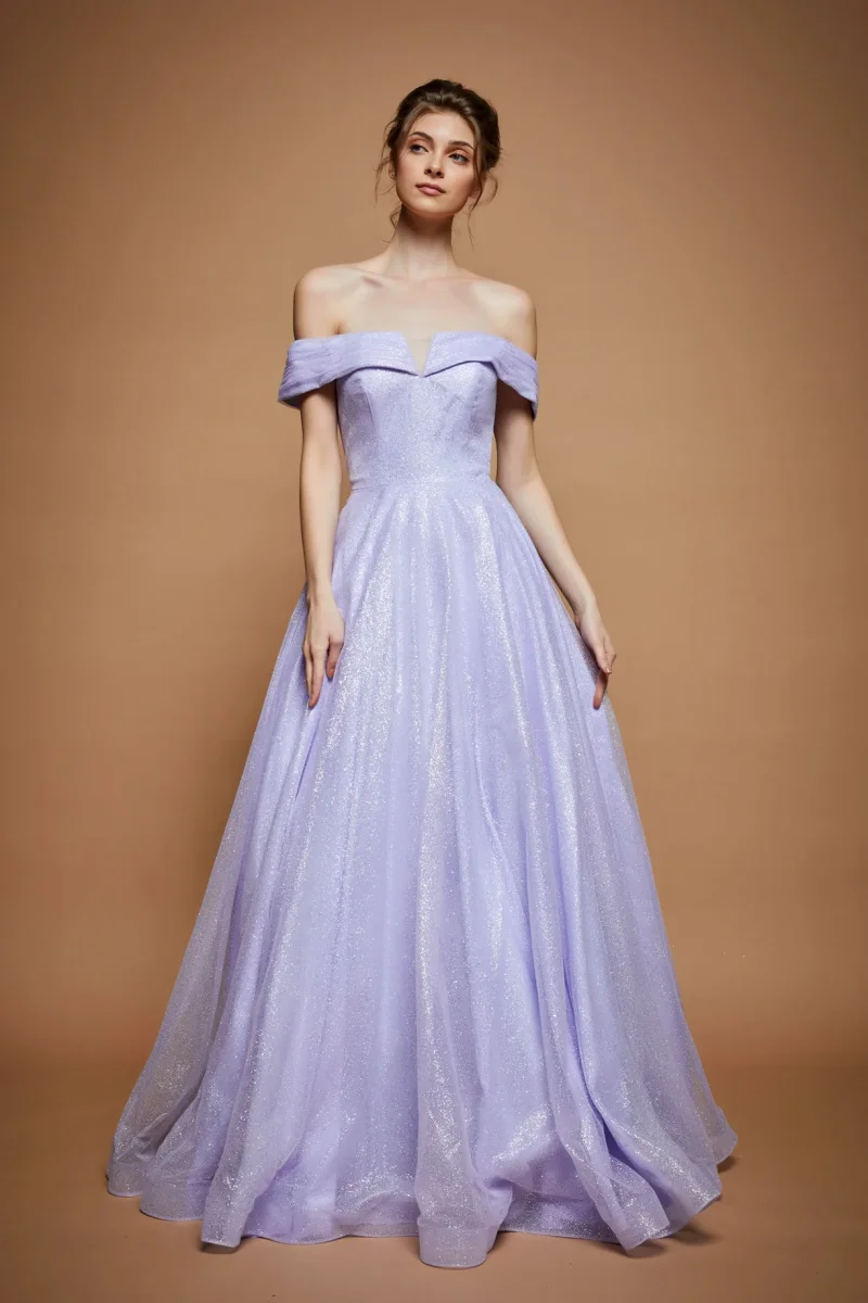 Vestido en Corte A al Hombro con Escote de Corazón de Tul con Brillos, Color Lilac