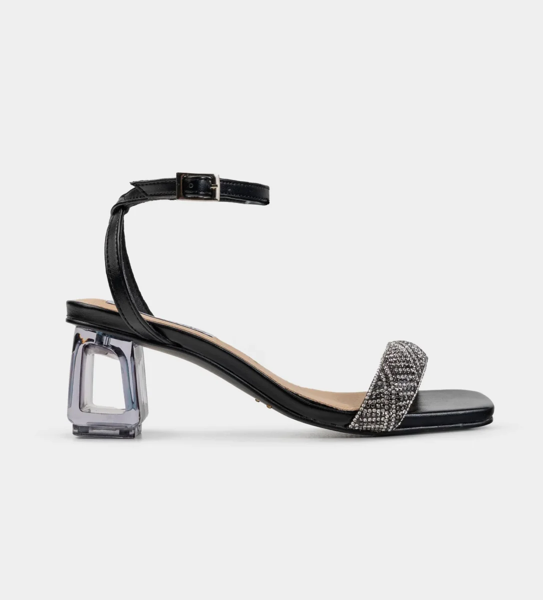 SANDALIA TACÓN BAJO GEOMÉTRICO NEGRO PEDRERÍA