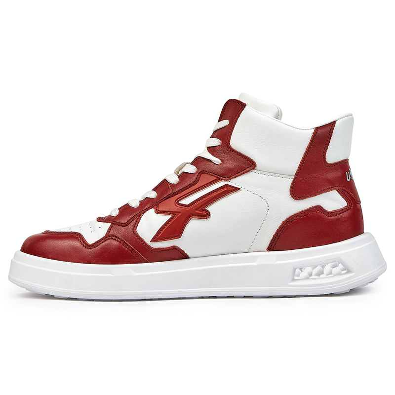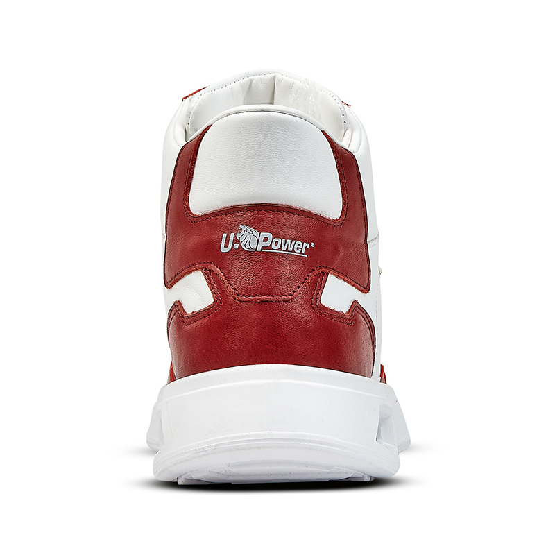 Sneaker U-Power Urban KALYSTA, unas botas de calzado de seguridad caracterizada principalmente por su diseño con corte de suave piel blanca con inserciones amaranto, una especie de color rojo. Por dentro, contiene una plantilla extraible de cuero junto un forro de piel blanca, manteniendo la esencia del color principal del calzado.
