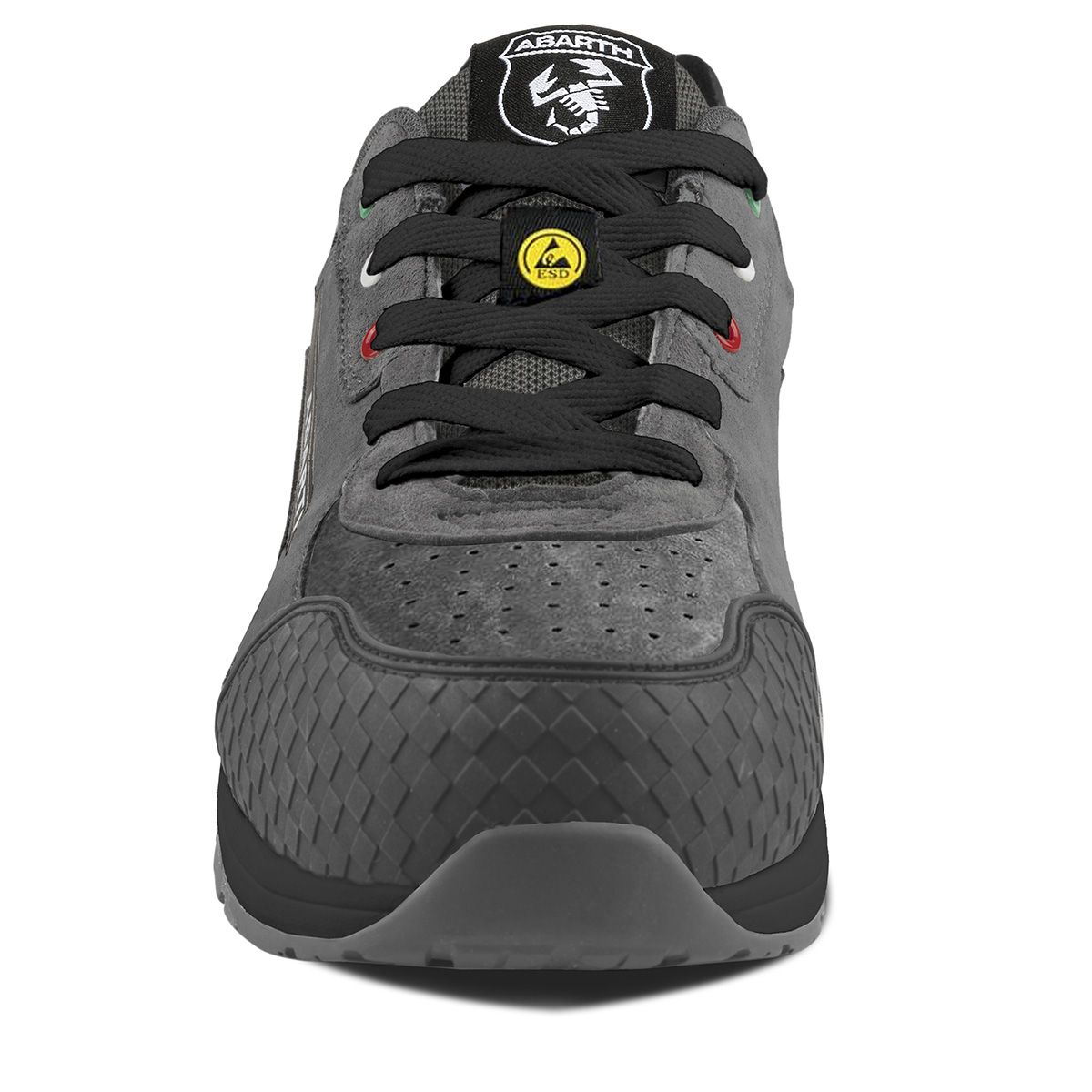 Zapato de seguridad S3, con forro interior de excelente calidad para mejor transpiración. La línea de calzado Abarth 595 está fabricada y certificada según la Norma EN ISO 20345:2022, con puntera de fibra de vidrio extra resistente y plantilla textil anti-perforación.