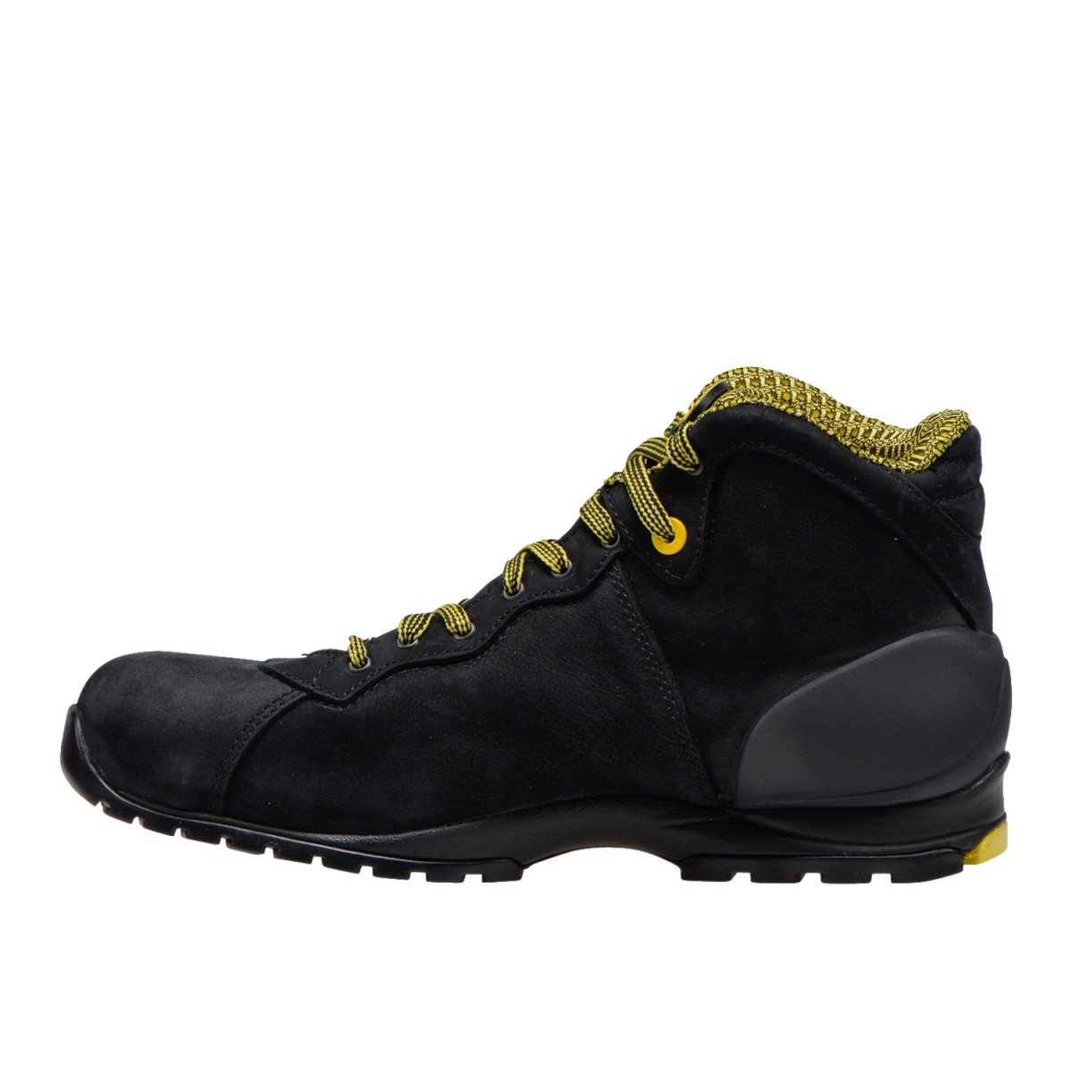 Calzado de seguridad mid cut S3S de nobuk hidrófugo, con puntera de aluminio 200J. Ajuste 11. Forro Air Mesh bicolor de resistencia elevada, K SOLE, película de poliuretano termoplástico e inserción Double Action. Plantilla extraíble de látex y carbón activo, talonera de EVA.