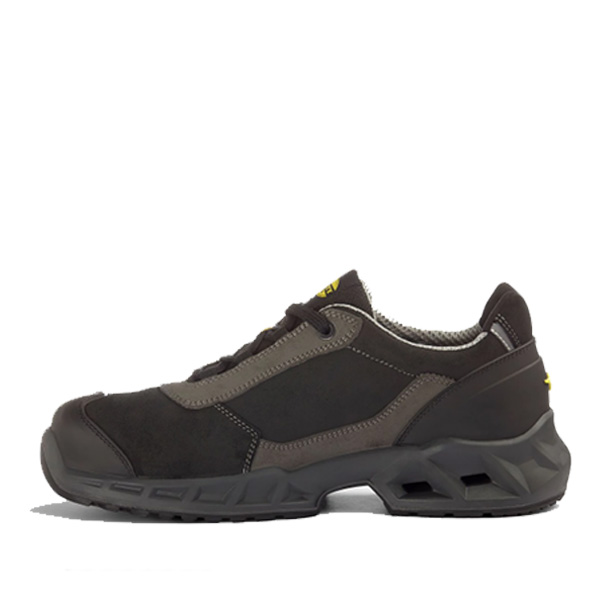 Calzado de seguridad altura baja S3S de serraje, repelente al agua con tecnología de amortiguación Stable Impact System. Puntera de aluminio 200J. Ajuste 11. Forro Air Mesh tridimensional de poliéster 100 % con antidescalzante de microfibra, K-SOLE, plantilla de espuma PU extraíble, transpirable y con carbones activos. ESD. Protección de la punta y del talón de TPU.