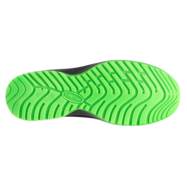 El calzado de seguridad barato Exena REBEL de la línea de calzado Active. Viene con un diseño deportivo cuyos colores son el negro acompañado de detalles en verde y en blanco, además de contener el logo de la marca Exena por los laterales de la zapatilla.