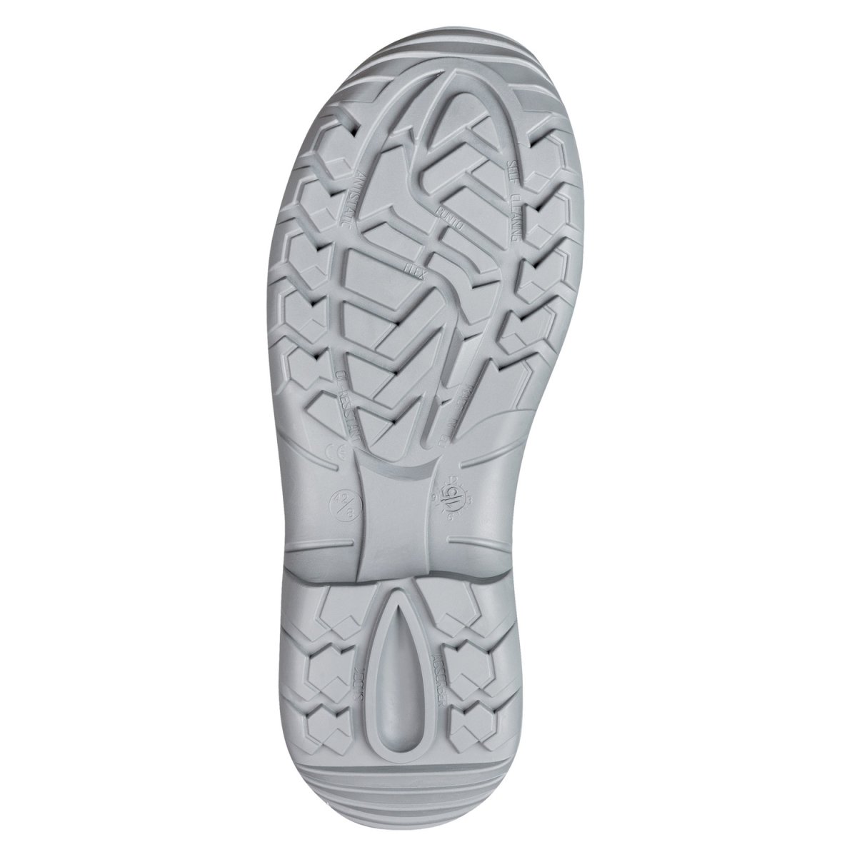 Por la parte de fuera del zapato, podemos ver su corte exterior de piel afelpada. Seguido de una puntera de seguridad de Composite, capaz de resistir hasta 200 Julios. Por la parte inferior del calzado, se encuentra su suela hecha de PU 2D con propiedades antideslizantes con certificado SRC.