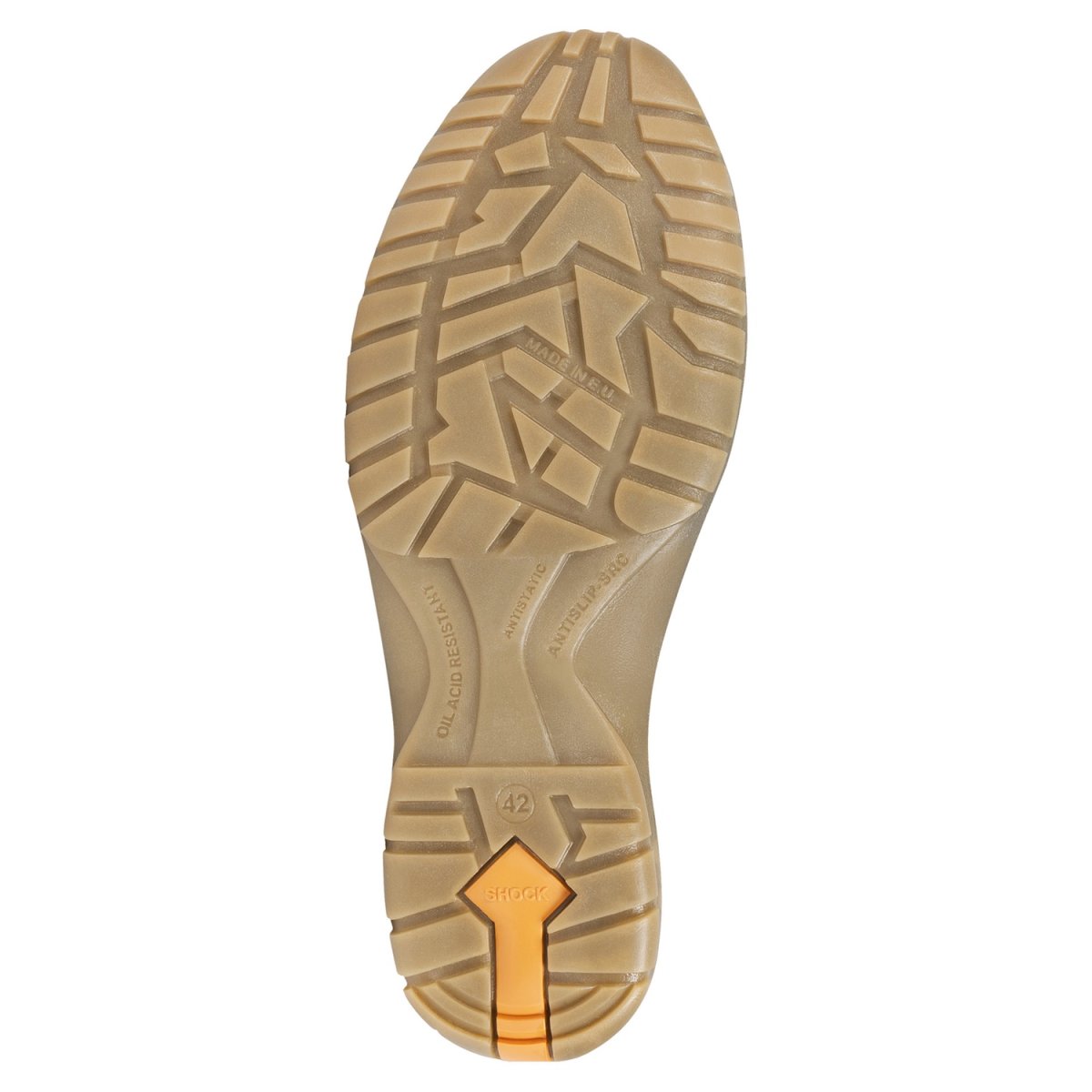 Por la parte de fuera,concretamente la parte superior, viene con un corte de gamuza y textil transpirable, manteniendo el zapato fresco durante el dia. En caso de la puntera,está hecha de composite, pudiendo aguantar hasta 200J. Por la parte inferior, el zapato está equipado con con una suela de PU con propiedades antideslizantes.