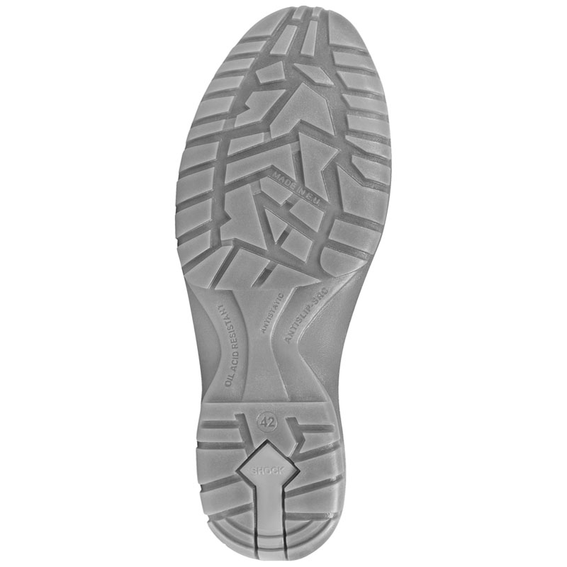 Por la parte de fuera,concretamente la parte superior, viene con un corte de cuero de gamuza y textil transpirable. En caso de la puntera,está hecha de composite, pudiendo aguantar hasta 200J. Por la parte inferior, el zapato está equipado con con una suela de PU con propiedades antideslizantes.