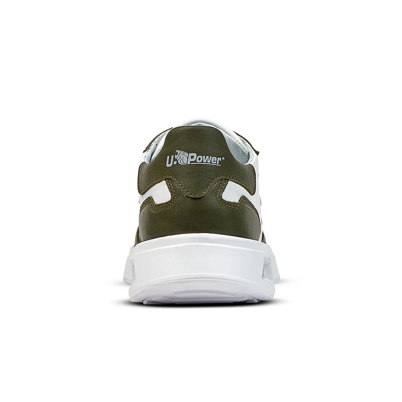 El calzado de seguridad U-Power de color blanco con un corte con inserciones verdes por la parte superior. Se caracteriza por su suela antideslizante con tecnologia PU con inserto Infinergy para que puedas trabajar a gusto tanto en el sector de la hosteleria como el de la peluqueria.